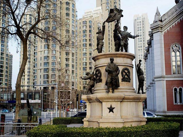 以金湯橋為中心,在海河東岸和西岸各有一座公園,公園的道路呈放射狀向金湯橋匯聚,寓意“會師”。兩岸公園的綠地中各放置一組以解放軍東北部隊和華北部隊為題材的群雕,真實再現(xiàn)了當年會師的情景。