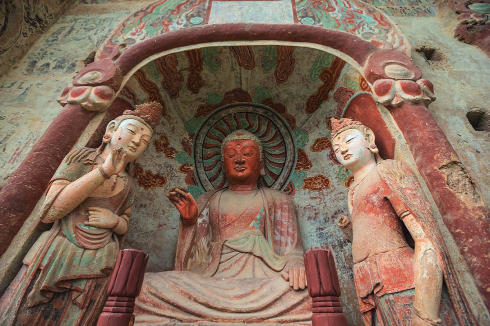 麥積山石窟,現(xiàn)存有221座洞窟、10632身泥塑石雕、1300余平方米壁畫,以其精美的泥塑藝術(shù)聞名世界,被譽(yù)為東方雕塑藝術(shù)陳列館。