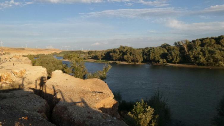 這里的黃昏非常美,夕陽染紅了天空,再倒映在美麗的額爾齊斯河面上。彩灘的不遠(yuǎn)處,是一排排風(fēng)力發(fā)電機(jī),原始和現(xiàn)代在這里交錯,卻又顯得格外和諧。