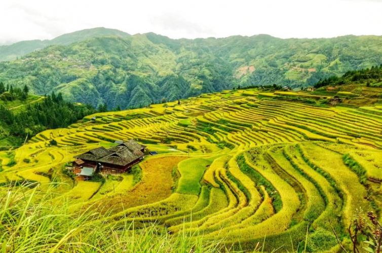 由于海拔不同,哪怕是同處于一座山坡的梯田,顏色也不盡相同,再加上散落田間苗家吊腳樓人家的點綴,才有了這難得的秀美風光。