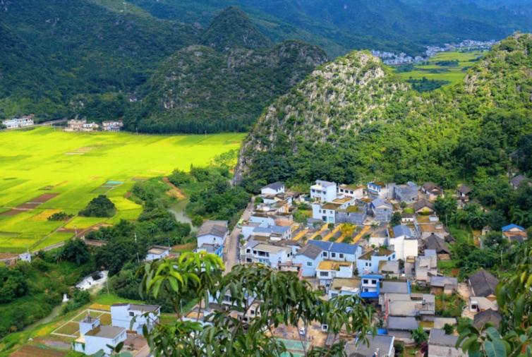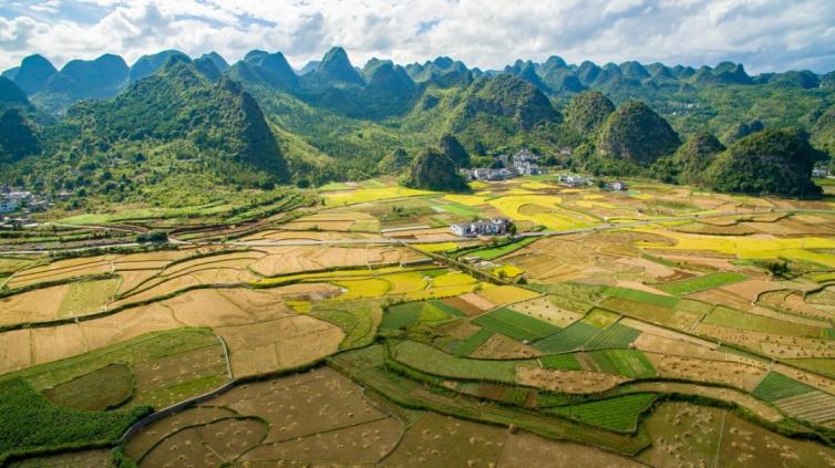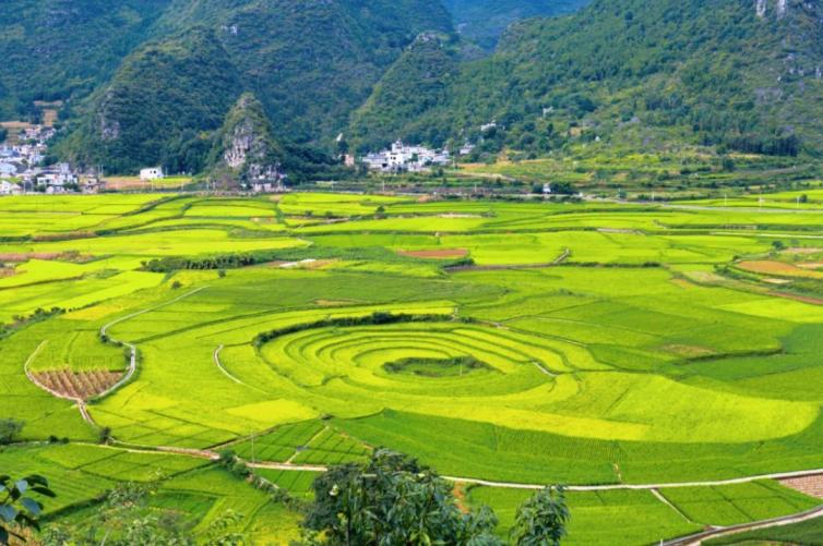 秋日里,一塊一塊的稻田金黃,在大地上一圈一圈地編織出金色的錦繡,與延綿的峰林,互相映襯,構(gòu)成了秋天里最詩意的田園畫卷。