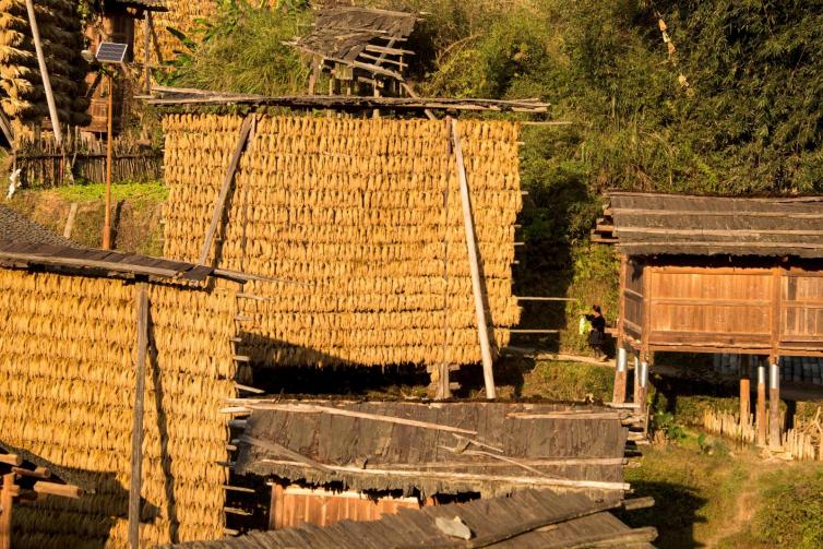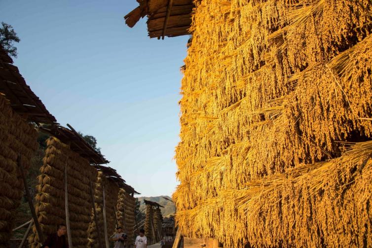 禾晾是占里秋收最獨特的一道風景,房前屋后的禾晾架上晾曬著香禾糯,一排一排,放眼望去,一片金燦燦。