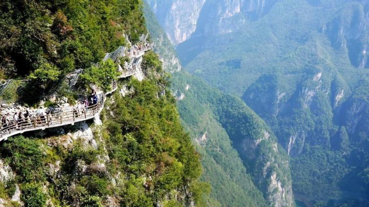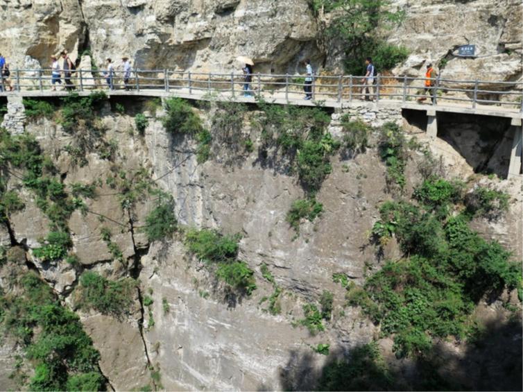 該棧道以其絕壁凌空的恢弘氣勢和令人頭暈?zāi)垦5囊曈X感受讓人膽戰(zhàn)心驚。因為害怕,游客有的扶著墻走,有的趴在地上走,有的被人牽著走,尖叫聲陣陣入耳,極致刺激的恐高感受讓人回味無窮。