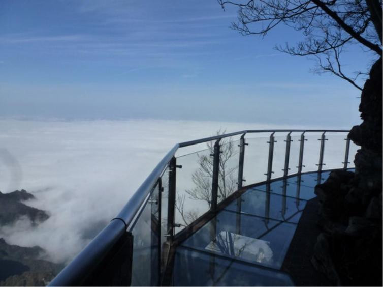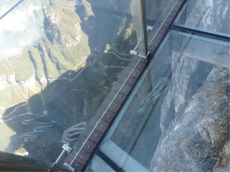 白石山玻璃棧道為混凝土框架結(jié)構(gòu),3.2厘米厚的雙層夾膠玻璃與不銹鋼龍骨架巧妙結(jié)合,每平方米承重達(dá)1000公斤,十分安全。