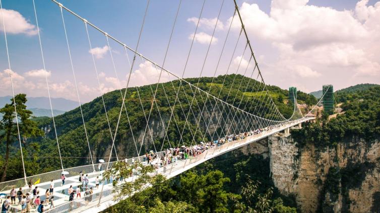 世界首座斜拉式高山峽谷玻璃橋,世界最高最長玻璃橋,首次使用新型復(fù)合材料建造橋梁世界最長玻璃橋面人行橋,世界最高的玻璃面人行橋,橋面上建有世界最高蹦極臺,世界最陡溜索,世界首座大張開量空間索面懸索橋,世界首座玻璃作為主要受力結(jié)構(gòu)的大型橋梁,世界上主梁的高度和跨度比最小的橋梁,世界首座超大跨度而沒有抗風(fēng)纜的懸索橋,世界首座同時采用多種減震裝置來遏制不同方向振動的橋梁。