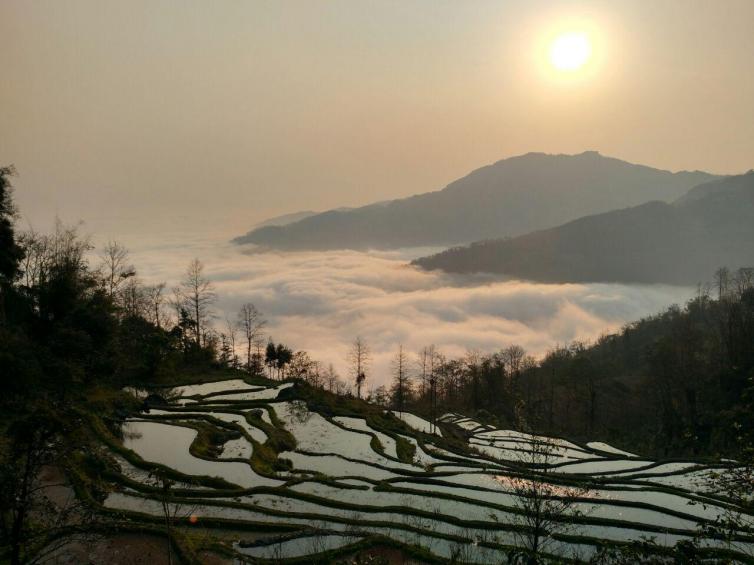 美 景:元陽哈尼族開墾的梯田隨山勢地形變化,因地制宜,坡緩地大則開墾大田,坡陡地小則開墾小田,甚至溝邊坎下石隙也開田,因而梯田大者有數(shù)畝,小者僅有簸箕大,往往一坡就有成千上萬畝。