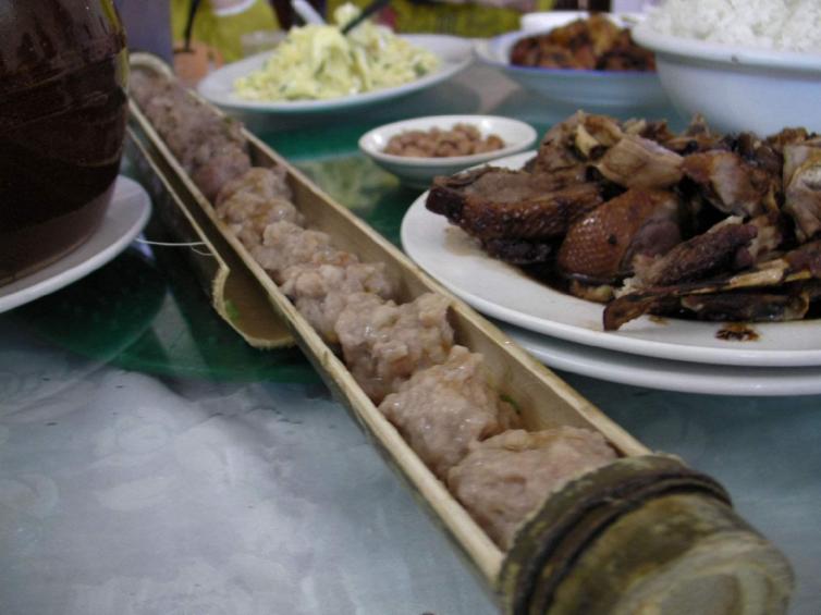 竹筒燒肉是哈尼人招待貴賓的一道名菜。燒肉所用的竹筒是當(dāng)?shù)靥赜械南阒?,選用生長一年左右的青竹,一頭留節(jié),一頭開口。在開口處裝入肉塊或肉絲,再用香茅草或芭蕉葉塞滿開口,放在炭火上烘烤,異香撲鼻,食后唇齒留香,令人回味無窮。