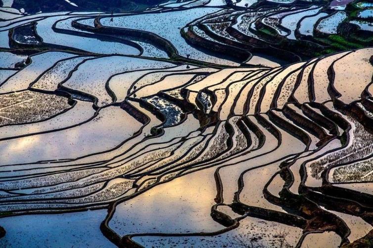 老虎嘴梯田,6000多畝梯田分布于深谷,站在高高的老虎嘴上俯視,如潮似海,仔細觀看,隱約有兩匹奔馳的駿馬,仿佛講述著哈尼先民開墾梯田的滄桑史。老虎嘴被美國攝影家稱為世界上最壯麗的田園風光,往東遙望,數(shù)千畝梯田攀附在七座半圓型山梁上,全陽光傾瀉,波光粼粼,形成立體的海洋。