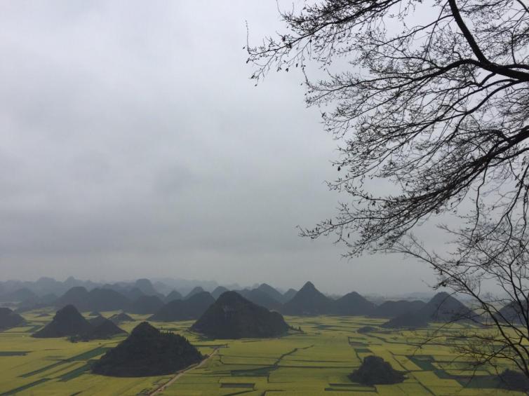 登上金雞峰叢,油菜花漫山遍野鋪天蓋地,秀峰、村舍、道路、河流,皆融匯入油菜花海,近處村落點點,遠處孤山聳立,蔚為壯觀。