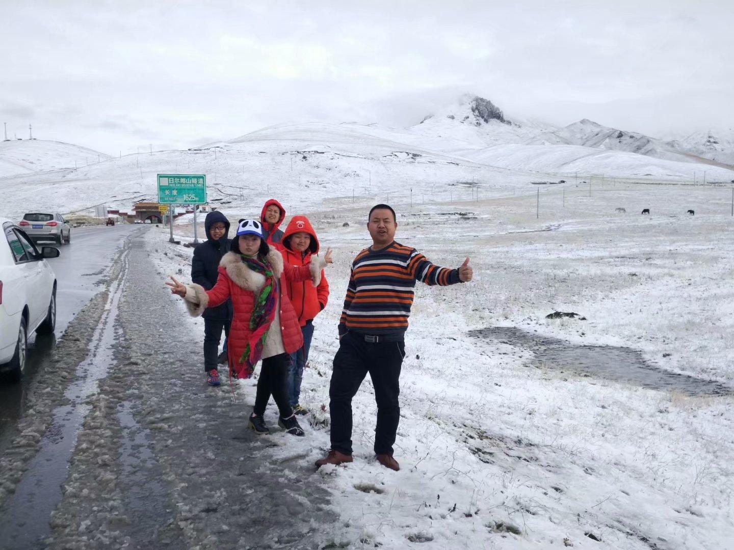終于在天黑之前兩家人匯合,為了體驗草原風情,我們決定露營,但是為了安全,在一家牧民 旁邊搭起了帳篷,主人給我們提供熱水,并熱情的推薦了羊肉粉湯和手撕牛肉。味道真心不錯,大塊吃肉,小口喝酒,也是一種愜意,只是餐具太不講究,吃到杯盤狼藉才想起沒有拍照。飯吃到了結(jié)尾漸漸下起了小雨,空氣開始變得又潮又冷,趕緊收拾后躲進帳篷里,半夜,在帳篷里冷醒了,感覺雨越來越大,哪還顧得著搬進大帳篷的事,直接躲進車里,一直感覺腳不暖和,四周一片漆黑,主人家不時的犬吠聲開始我們難眠的下半夜,兒子和我聊天:媽媽,我們是不是也像是人在囧途?在車里變換了無數(shù)個姿勢后盼來了天明,是說一夜覺得冷,車窗上厚厚的一層雪,整個世界一片白茫茫,呵,若爾蓋的初雪啊,就這樣和我們不期而遇了。喜歡看韓劇的我經(jīng)常在劇里看到:只要在初雪時和心愛的人一起看,就會永遠幸福的在一起,關(guān)于初雪的唯美讓我們的心情變得如此興奮,只是主人家的藏獒破壞了我們的好心情,不停的在我們腳邊跳來跳去,天生怕這玩意,我差點嚇哭了,哪還記得拍照的事情,老公有點高反,忙著給他吃藥,吸氧,在小藏獒的追趕中,在大雪紛飛中匆匆收拾離開,去到不到兩公里的縣城找早餐,這么冷的天,怎么得也得吃點暖和的東西吧。車子剛剛停住,店里幾個食客跑出來指著我們的車興奮的問我們從哪兒來,哪里下這么大的雪,而這大雪離他不足二里地,只是城里相對暖和,看不到雪花,真是奇特的天氣,我們再次覺得幸運。