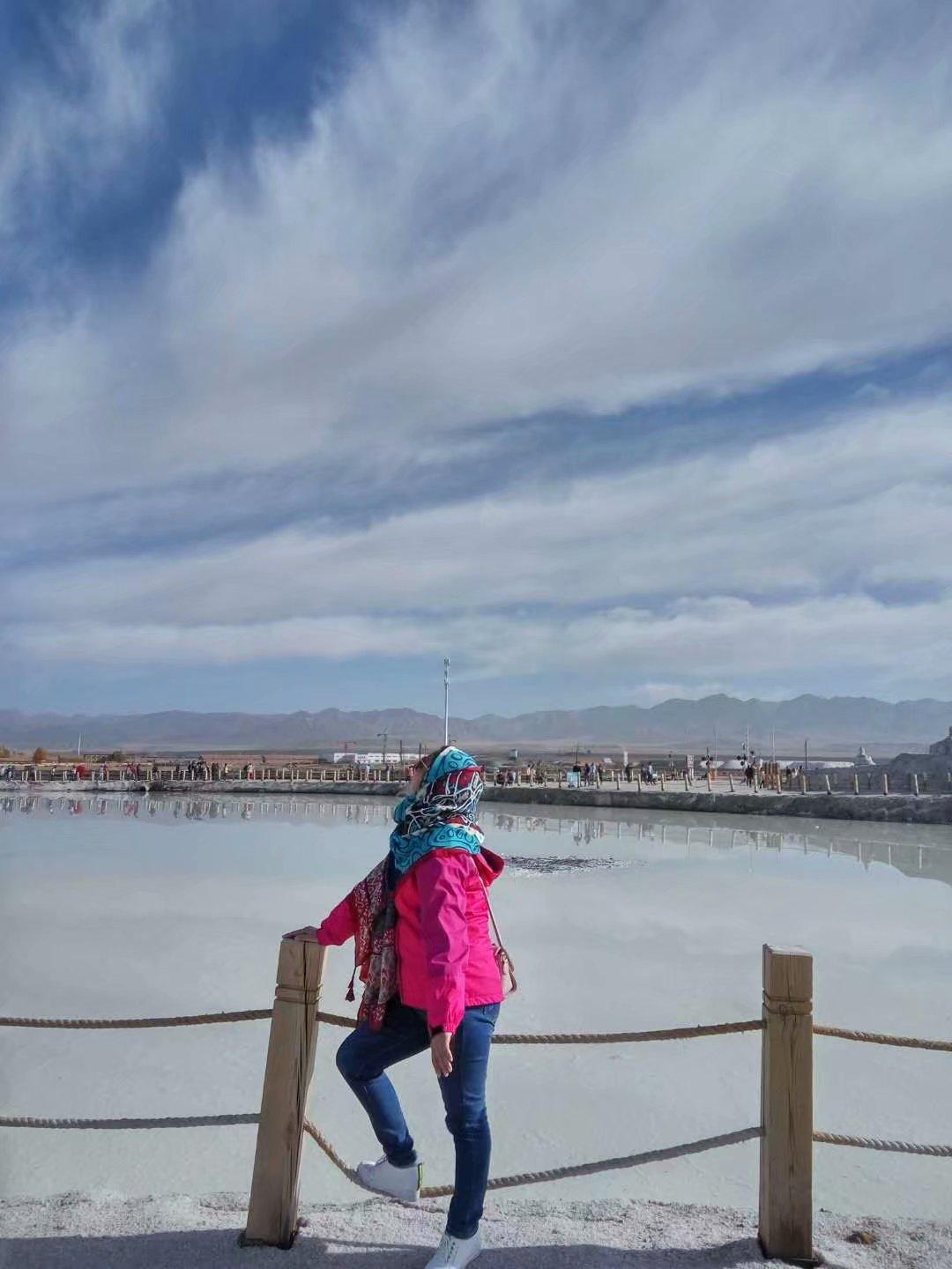 鹽湖不再允許穿鞋套下湖,對于每個來過的人都說一定要去湖里照倒影,那是最美的,湖面上好多人光著腳在湖面尋找自己最美的樣子,用手摸了摸水,冰涼,手變得黏黏的,像是油一樣,很膩,實在沒有光腳下去的勇氣,放棄,我這樣親近而不觸摸也是一種體會吧!藍天白云悠悠,在似夢似幻之間體味別樣的美!