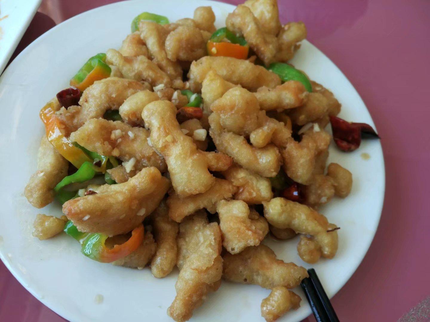 兒子一直念的糖醋里脊,和我們平時吃的差別太大,但總的來說味道像酥肉。餓了吃啥都是香的!