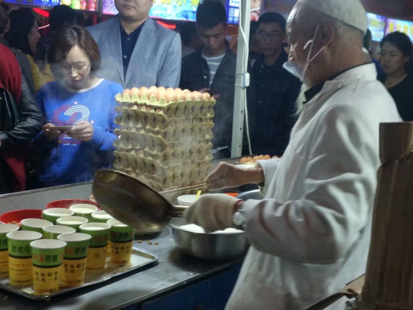 吃飽了不是逛而是睡,估計體重也很對得起自己了。天黑前,妹妹一家會合,放下包就說要尋找吃的,地圖是個好東西,沒費力就找到了蘭州的正寧路夜市小吃一條街,吃了同學特別推薦的羊雜碎,問“度娘”據(jù)說制作羊雜碎還講究"三料"、"三湯"、"三味"。的確不負盛名,湯汁香濃,但我不喜歡吃羊肝。但是最讓我記住的卻是舌尖上的中國都上了的牛奶雞蛋醪糟,等自己買了喝了才發(fā)現(xiàn)電視上那個馬大爺在淡定的熬著。身后是長長的隊伍,這才是過國慶的節(jié)奏,真是好喝,他們用銅鍋煮牛奶,加入醪糟,放入各色干果,葡萄干,喝一口再嘗嘗里面的果脯,真是特別的美味,讓我想想小時候在家用醪糟兌涼開水也覺得特別好吃啊。讓食特撞出這樣的火花,不得不為人們的智慧點贊。擠了一路,吃了一路,感覺自己像打一了場仗出來。