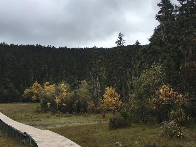 10月的普達措層林盡染,黃綠色草甸還肥厚沒有枯萎,藍天白云還在,走到哪里都有小松鼠在旁邊蹦蹦跳跳,湖泊依舊如明鏡,等到冬天下雪,這里變宛若童話王國。