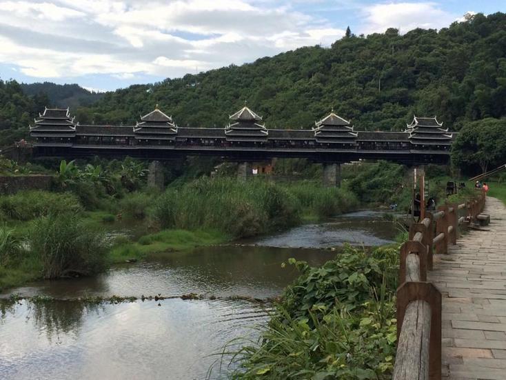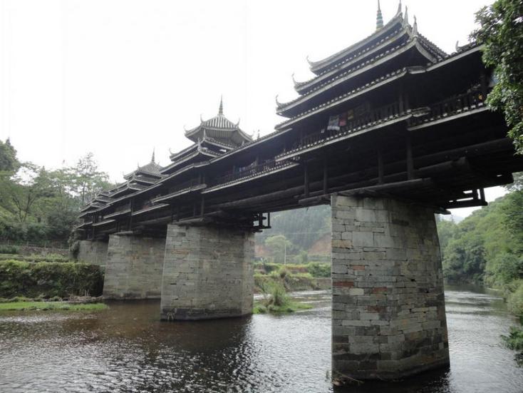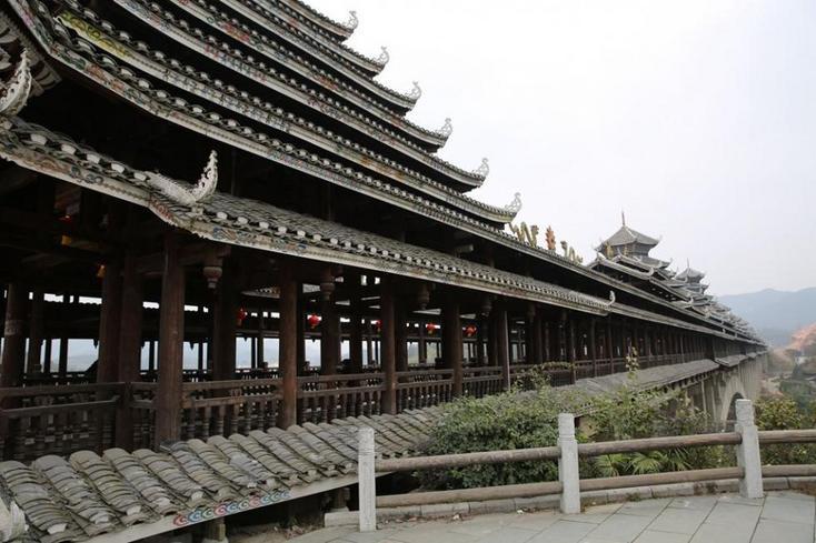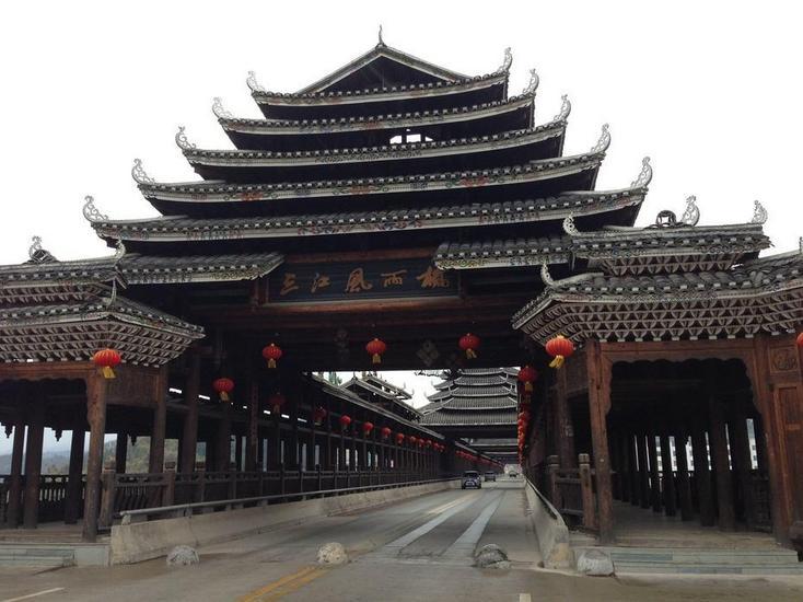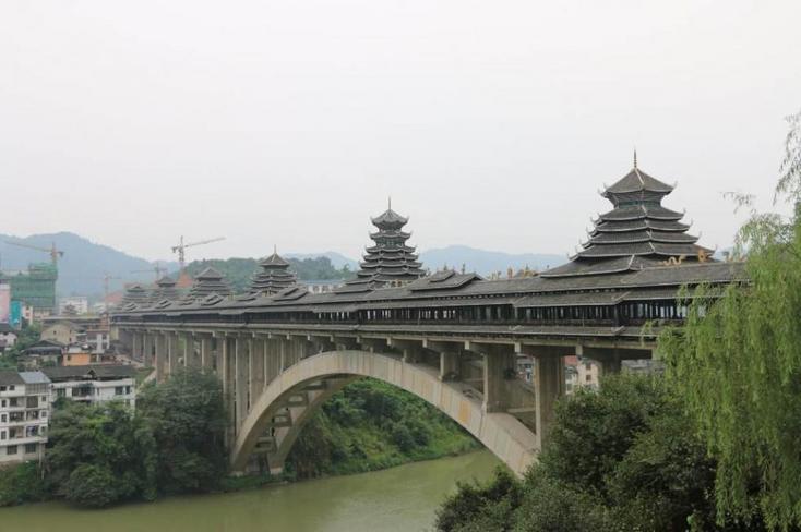 三江風(fēng)雨橋位于廣西柳州三江侗族自治縣潯江河上,由鋼筋混凝土月牙形單橋拱和集侗族特色木構(gòu)建筑技藝精華于一體,有7個(gè)橋亭,其長(zhǎng)度和規(guī)模均為世界之最,堪稱(chēng)世界第一風(fēng)雨橋。