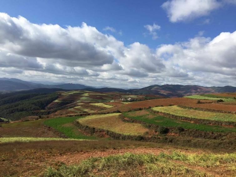 土豆的花朵也開始了熱情的綻放??梢哉驹诟咛幭蛳赂┩?,各種各樣的顏色全部呈現(xiàn)在眼前,他們就像一塊被打翻了的巨大調(diào)色板,無(wú)意間創(chuàng)造出一幅絢麗壯觀的美麗畫卷。這一片東川的紅土地位于昆明市東川區(qū)新田鄉(xiāng),它距離東川有40多公里路程。