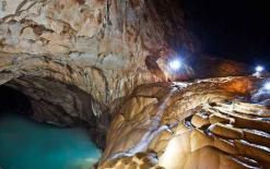 從洞口行舟至300米轉(zhuǎn)折處,距水面30米處有一圓形天窗,山坳之光照到水面,猶如舞臺(tái)上的光束,色彩紛呈,近右側(cè)洞口處有沙灘,可停靠舟船。沙灘右側(cè)是一塊30多平方米的石臺(tái),臺(tái)面深溝淺窩,坑坑坎坎,石臺(tái)一側(cè),洞壁雪白,可攀援其中。有石鷹、石柱、石幔、石觀音菩薩等,百態(tài)千姿,令人目不暇接。其奇特的景象似桂林蘆笛巖,又因非乘舟不能游覽,游人贈(zèng)予“水上蘆笛巖”的美譽(yù)。