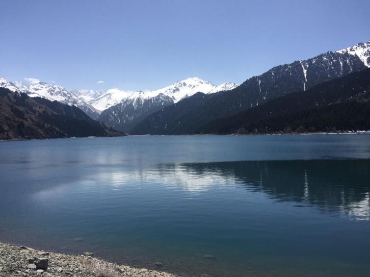 天池在博格達(dá)峰的下的半山腰,是由古代冰川和泥石流堵塞河道而形成的高山湖泊。山峰上的冰川積雪閃爍著皚皚銀光,與天池澄碧的湖水相映成趣,構(gòu)成了高山平湖綽約多姿的自然景觀。