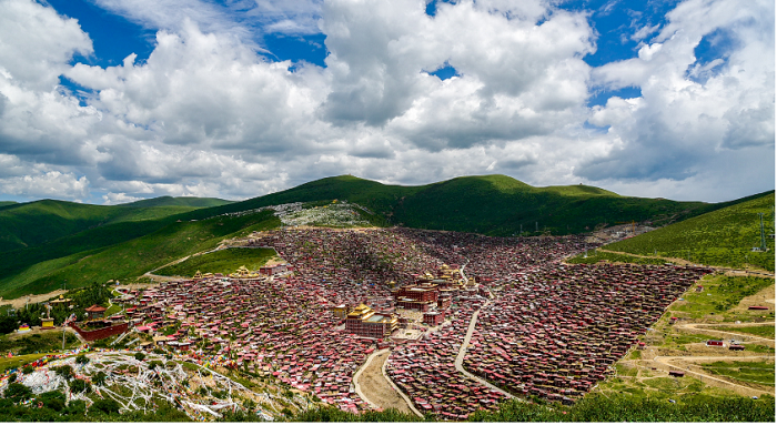 紅色的佛國(guó),蒙上潔白的雪花,絳紅與雪白交相輝映,一片寧?kù)o祥和。沒有交織的游人、沒有喧鬧的車流,雪中的色達(dá)靜謐的能仿佛聽到自己內(nèi)心的聲音。