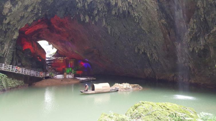 洞天仙境又叫穿天巖,是英西峰林一個(gè)溪流穿山而過的巖洞,乘船游覽,流程約200米,洞內(nèi)洞廳廣闊,鐘乳石形態(tài)多樣,洞頂有2個(gè)穿孔通天,光線從中透入洞里。洞內(nèi)有一片陸地,生長著茂盛的陰生植物,密密麻麻,枝葉婆婆,呈原始狀態(tài),像這樣的洞內(nèi)小森林確是一個(gè)罕風(fēng)奇觀??粗@里有光、有水、有地、有林,感覺像走入另一個(gè)世界。