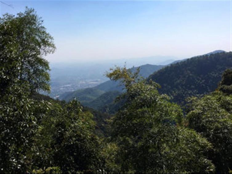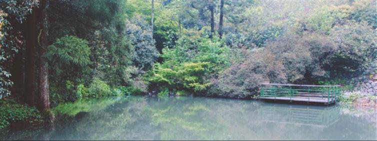 天橋橫架于一泓溪水之上,一端連接上山的竹徑,通向幽深的竹林,另一端連接向下的石級。每當大霧迷漫的日子,只有天橋還隱約可見。云天一色,小橋宛如在天上一般,這大概就是天橋命名的由來。從天橋左側下行數(shù)步,有一座綠瓦紅柱的亭子。在一個方圓不大的空間,從天橋而下,經(jīng)小亭,到花圃,分成三個層次,卻毫無局促之感。