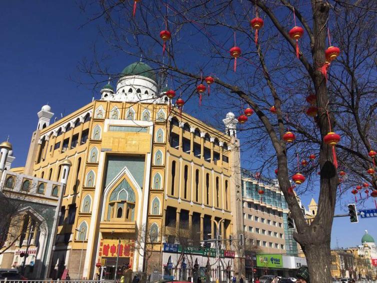 伊斯蘭風(fēng)情街位于呼和浩特市回民區(qū),全長1150米,街道兩側(cè)以疊澀拱券、穹隆、彩色琉璃磚裝飾出來的高樓氣勢(shì)宏偉,排排尖拱形并列的門窗、渾厚飽滿的綠色或黃色的球形殿頂、高聳的柱式塔樓,以沙漠黃為主而綠白相間的色調(diào),讓人領(lǐng)略到濃郁的伊斯蘭風(fēng)情。