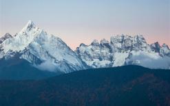 遠(yuǎn)眺梅里雪山主要有兩個(gè)地方,一個(gè)是飛來(lái)寺觀景臺(tái),另一個(gè)是霧濃頂觀景臺(tái),飛來(lái)寺觀景臺(tái)未建成前,大多數(shù)游客都是在這里遠(yuǎn)眺梅里雪山的。 在這里拍攝梅里雪山全景,可以將飛來(lái)寺村和河谷作為前景。東北向是白馬雪山,南向可以看到霧濃頂村煨桑的青煙和瀾滄江峽谷煙云。