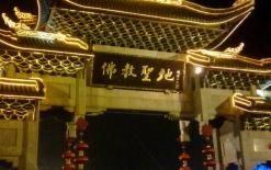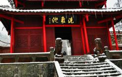位于峨眉山麓虎溪河畔,距離報(bào)國寺不到500米,是進(jìn)入景區(qū)的第一道風(fēng)景,占地面積10000平方米。由“震旦第一山”、迎賓舞臺(tái)、“秀甲天下”山石瀑布?jí)?、峨眉山景點(diǎn)示意浮雕屏、“峨眉雅韻”文化山、售票亭等功能建筑以及集散休閑場(chǎng)所所組成,充分體現(xiàn)了峨眉山作為世界自然與文化遺產(chǎn)所蘊(yùn)含的深厚文化底蘊(yùn),是全國最大的生態(tài)旅游文化廣場(chǎng)。迎賓廣場(chǎng)的主體建筑之一,也是峨眉山新十景之一?!靶慵滋煜隆睗饪s了“峨眉天下秀”這一定論。站在瀑布前,只見一條白練懸掛于石壁上,飛濺的水花在空中形成一陣雨霧,陽光下彩虹隱現(xiàn)。迎賓廣場(chǎng)的標(biāo)志性建筑,從左到右,依次是寶掌和尚所提“震旦第一山”和康熙皇帝御提三個(gè)大字“峨眉山”,以及世界遺產(chǎn)標(biāo)志。迎賓灘也是峨眉山新十景之一,四周綠蔭環(huán)繞,山泉從石上流下,色如白練,似明珠鑲翡翠,水花跳躍奔騰,水聲歡快歌唱。