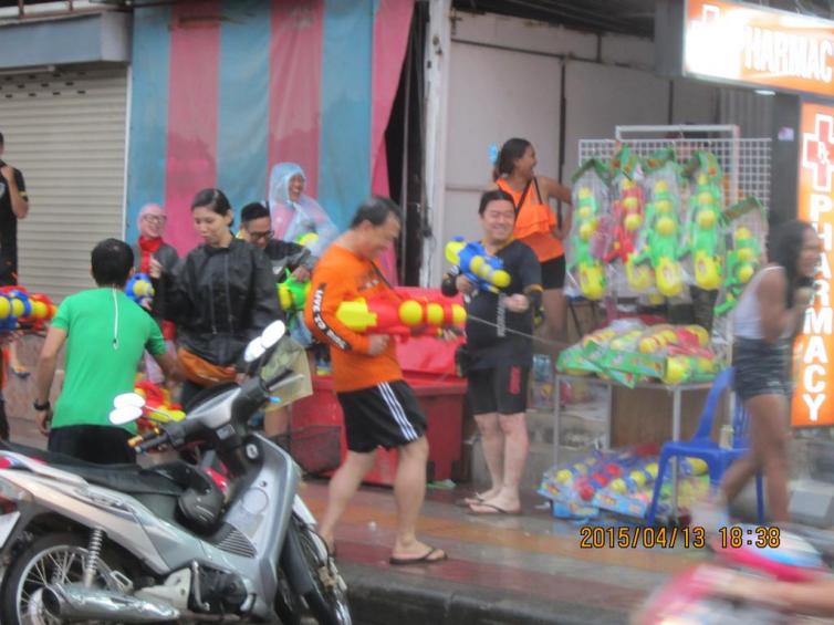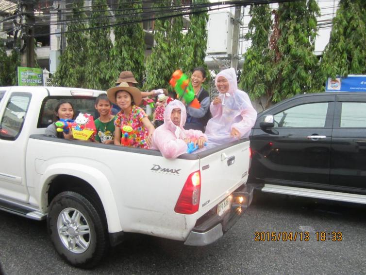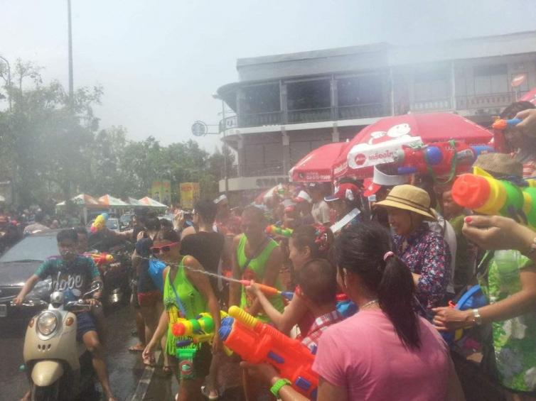 在整個清邁舊城以及周邊馬路上到處水花四濺,引人注目的美麗游行以及載滿人的卡車,人人拿著裝水的水槍往其他車輛和行人猛噴水,整個交通也大打結(jié)。