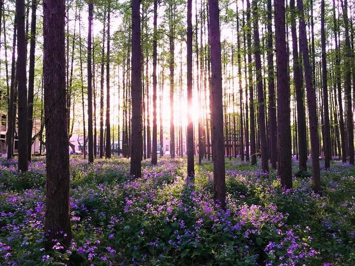 每年三月正是南理工?;?二月蘭競(jìng)相綻放的時(shí)節(jié)。宅旁、籬下、林中、山頭、土坡、湖邊,都是一團(tuán)紫氣,小花開得淋漓盡致。沿著南理工大學(xué)的二號(hào)大門進(jìn)入校園,淡淡的花香撲面而來。在成片的水杉林間,二月蘭的那一抹紫色顯得格外耀眼。清清淡淡的小花,繁密地鋪陳在亭亭的水杉林里,若不是有一根根隔離踐踏的紅繩,幾乎讓人有跌入畫境的不真實(shí)感。?