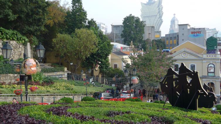 議事亭前地,民政總署。地上有很多碎石子鋪成,路兩頭店肆樹立,服裝化妝品兌換錢銀,包羅萬象。噴水池等等,也值得一看,晚上配上燈光效果讓議事亭前地生色不少。議事亭前地周圍能夠玩耍吃買一條龍,大三巴、郵政總局大樓、民政總署大樓、澳門博物館、大炮臺、哪咤廟、古城墻、盧家大屋、大堂、玫瑰堂、仁慈堂,還有很多手信店、小吃店(總店或分店)都在這鄰近!