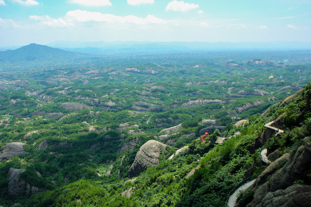 “百里丹霞”宛如一副無盡的丹霞畫卷,立于石牛寨山頂,放眼遠(yuǎn)眺,看不盡、數(shù)不清的丹霞丘峰。最炫的則應(yīng)該是“萬豚鬧海”,從觀光棧道居高臨下望去,連綿不盡的大片白色丹霞石丘似成群結(jié)隊(duì)的無數(shù)海豚,在綠色的海洋中追波逐浪,起伏翻騰,仿佛整個(gè)沉寂的山川都跟著在翩翩起舞,真是惟妙惟肖,似真似幻