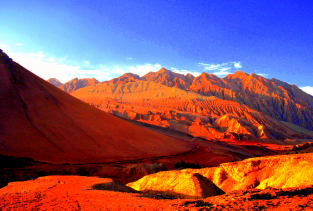 一.火焰山新疆火焰山位于吐魯番盆地的北緣。古書稱之為“赤石山”,維吾爾語稱“克孜勒塔格”(意為紅山),由紅色砂巖構(gòu)成,東起鄯善縣蘭干