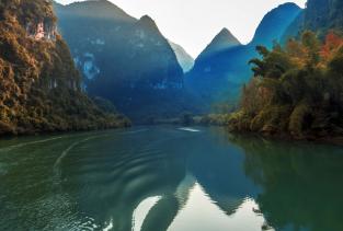 1.漓江—桂林市從桂林至陽朔的83公里漓江河段,是漓江精華,還有“深潭、險(xiǎn)灘、流泉、飛瀑”的佳景,集中了桂林山水的精華,令人有“舟行碧