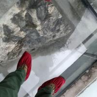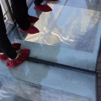張家界的這條天門(mén)山玻璃棧道可能是國(guó)內(nèi)最早的一個(gè),在山頂一側(cè),長(zhǎng)度估計(jì)二三百米,寬度大概兩米多,需要穿鞋套免得臟了地面。大多數(shù)人沒(méi)有表現(xiàn)出太多害怕。