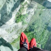 天門(mén)山景區(qū)有東線和西線兩段,兩段都分別有玻璃棧道(鞋套需要分段租)。早上東線較曬,下午西線較曬,陽(yáng)光充足當(dāng)然拍照也好看,就看個(gè)人喜好選擇先走哪邊了。 走東線玻璃棧道的時(shí)候,遇見(jiàn)一畏高男,后來(lái)看照片才發(fā)現(xiàn)他女朋友和友人就在旁白歡樂(lè)拍照。 玻璃棧道其實(shí)只要不專(zhuān)注往下看也不可怕,一直往下看,真有點(diǎn)暈。