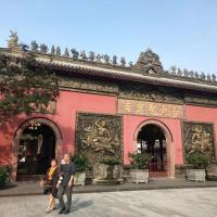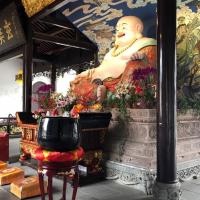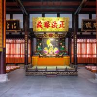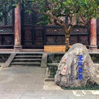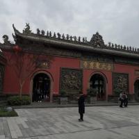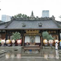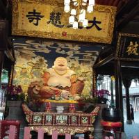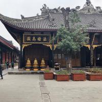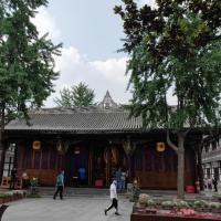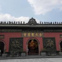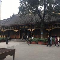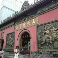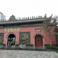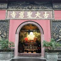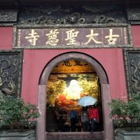 大慈寺位于成都市中心,與繁華的春熙路相鄰,周邊商業(yè)繁華(與上海的靜安寺一樣),里邊寧靜的世界與外邊繁華的世界完全不一樣,很多人都不知道原來里面有新世界。寺院已有千年歷史,屢毀屢建,現(xiàn)有建筑都是近代重修,規(guī)模宏大,香火鼎盛。