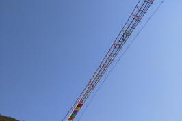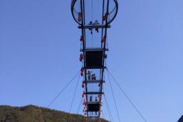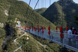 五龍河玻璃橋懸于天夢(mèng)湖兩側(cè)山峰之間,兩峰地勢(shì)險(xiǎn)峻,懸壁陡直,中間五龍河河水橫穿!玻璃橋長(zhǎng)約300米,垂直高度達(dá)180米,是目前省內(nèi)跨度最大和垂直高度最高的玻璃橋!