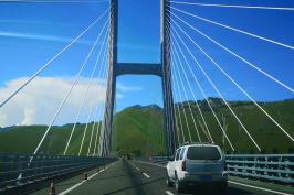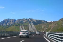 果子溝大橋全稱果子溝雙塔雙索面鋼桁梁斜拉橋,全長700米,橋面距谷底凈高達200米,是國內(nèi)第一座公路雙塔雙索面鋼桁梁斜拉橋,也是新疆第一高橋。