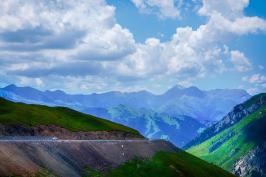 伊昭公路是古代絲綢之路“弓月道”的其中一段,其道路險峻異常,行走其間仿佛穿行在白云之上,公路傍河而建,路邊是緩緩的綠色的山坡。全長180公里,北起伊犁哈薩克自治州的昭蘇縣的夏特牧場,南至阿克蘇地區(qū)溫宿縣的破城子的夏特古道,溝通天山南北,風(fēng)景如畫處處充滿生機、活力。