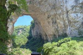 大七孔景區(qū)是以原始森林、峽谷、伏流、地下湖為主體的景區(qū)。景觀峻險神奇、氣勢雄峻磅礴,山高谷深,水流湍急,洞中有瀑,瀑下有湖,湖上有天窗,陽光投下形如日月星斗,還有一座高80余米的天生橋巍然而立被專家們譽為“大自然神力所塑造的東方凱旋門”