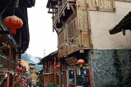 磨西古鎮(zhèn)建在一個(gè)東西北三面繞水環(huán)山的傾斜高臺(tái)平地上,古鎮(zhèn)入口岔成兩條馬路。一條通往古鎮(zhèn),一條穿過新城,繞城后匯合成一圈。石板鋪設(shè)的古鎮(zhèn)上,樓房緊挨著聚集于路兩邊。古民居實(shí)際上已不多見,較具特色的是1918年法國(guó)傳教士修建的天主教堂。
