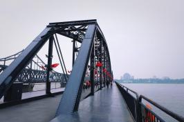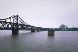 丹東鴨綠江斷橋,斷橋原為鴨綠江上第一座橋,始建于1909年,長(zhǎng)944.2米,寬11米,十二孔,從中方數(shù)第四孔為開(kāi)閉梁,以四號(hào)圓形橋墩為軸,可旋轉(zhuǎn)90°,便于過(guò)往船只航行。每次旋轉(zhuǎn)須20分鐘??姑涝瘧?zhàn)爭(zhēng)期間被美軍炸毀。中方一側(cè)殘存四孔,成為抗美援朝戰(zhàn)爭(zhēng)的歷史見(jiàn)證。