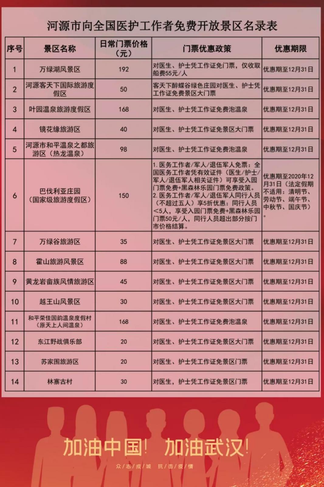 為致敬奮斗在抗疫一線的全國(guó)醫(yī)務(wù)工作者,河源市文化廣電旅游體育局和河源市景區(qū)協(xié)會(huì)向全市旅游景區(qū)提出倡議,對(duì)全國(guó)醫(yī)護(hù)人員實(shí)行門票免費(fèi)的優(yōu)惠政策。倡議發(fā)出后,全市旅游景區(qū)積極響應(yīng),目前,14家景區(qū)實(shí)行免費(fèi)優(yōu)惠政策,景區(qū)自開放營(yíng)業(yè)之日起至2020年12月31日止,全國(guó)醫(yī)護(hù)工作者憑有效證件(醫(yī)師證、護(hù)士證或與醫(yī)務(wù)工作相關(guān)的其他資格證件)可免費(fèi)入園?。ㄔ斍檎?qǐng)查看下面各景區(qū)優(yōu)惠措施)