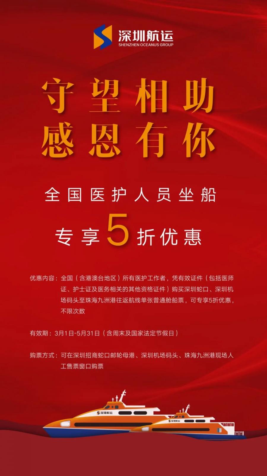 疫情當(dāng)前,為向不畏艱險(xiǎn)、無(wú)私奉獻(xiàn)的全國(guó)醫(yī)護(hù)工作者表達(dá)敬意與感謝,從3月1日起,深圳航運(yùn)集團(tuán)旗下鵬星船務(wù)有限公司聯(lián)合珠海九洲客運(yùn)推出面向全國(guó)醫(yī)護(hù)工作者的專享5折船票優(yōu)惠。