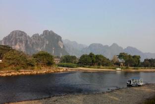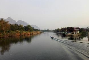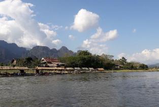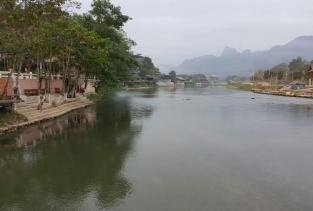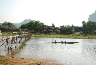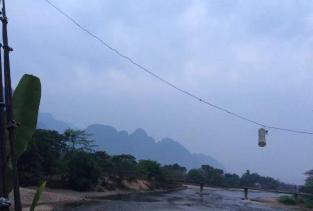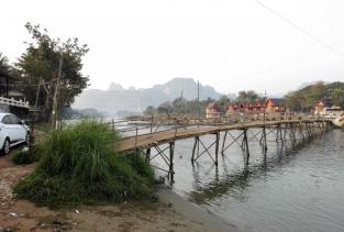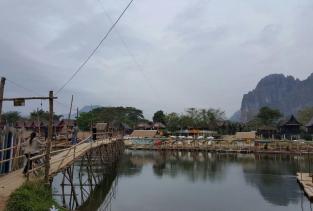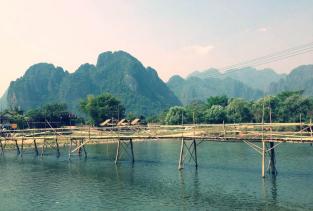 南松河,老撾‘廢都’萬榮的精華所在。民眾過河靠東南亞特色的竹橋,機(jī)動(dòng)車則可從鎮(zhèn)內(nèi)唯一的鋼索簡易橋過江,費(fèi)用一個(gè)來回程兩萬基普。