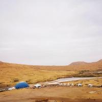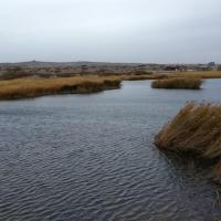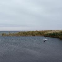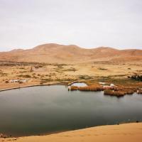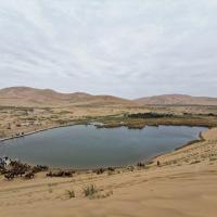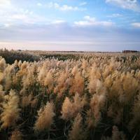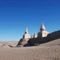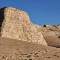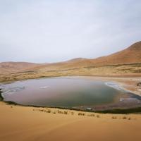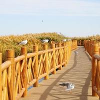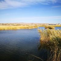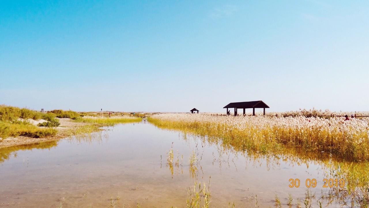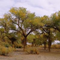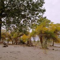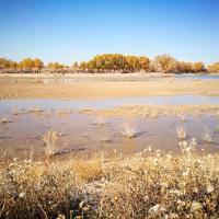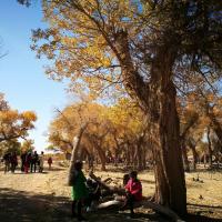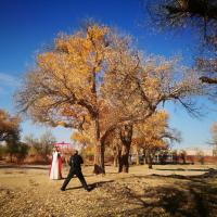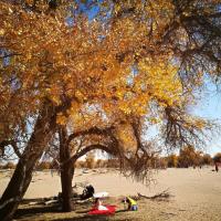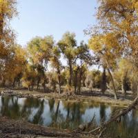 居延海河面寬闊而平靜,清澈的河水倒映著藍(lán)天、白云與秋林,真像一幅色彩濃艷的油畫呵!面對如此美景我只能瞠目結(jié)舌地呆立岸邊觀賞良久,待稍定神后,才抬腿過橋往對岸走去。胡楊林外圍了一圈形同虛設(shè)的鐵絲網(wǎng),有不少缺口可隨意出入。當(dāng)我完全融入那片金色的海洋時,感覺自己也被染成了金色,渾身仿佛也感到了火光映照的融融暖意。