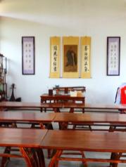 東坡書院的門口有一顆古老的滑桃樹,是當時的儋州知州所栽。一進書院便是載酒亭,徑直穿過載酒亭就是載酒堂,載酒堂是宗祠樣式的,位于整個東坡書院的中心,據(jù)說是蘇東坡講學和會友的地方,門頭正中掛著一塊“先生悅之”的大匾。