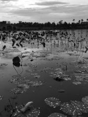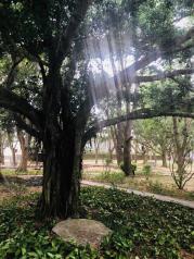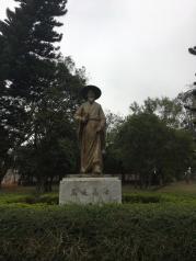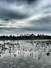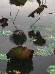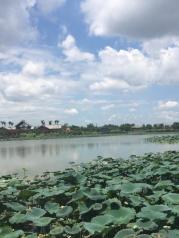 東坡書院是蘇東坡被貶到儋州建立的書院,書院外,有一大片荷塘,我們?nèi)r(shí)荷花均已敗落,也趕上下雨,雨點(diǎn)打在荷葉上滴滴答答,立即想起李商隱的詩句:留得殘荷聽雨聲。太有意境了。于是拍下下幅照片,遠(yuǎn)處的云,中間大片的枯荷塘,近處載滿雨滴的荷葉,太美了。