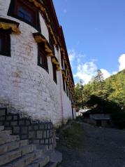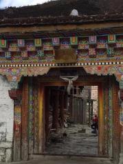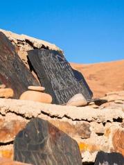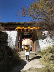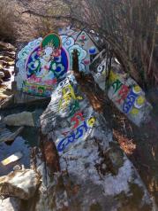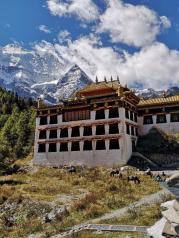 稻城沖古寺四周的墻角邊,堆砌著寫著梵語的石板。 我走過供奉著佛祖釋迦牟尼佛像的經堂,來到寺廟的庭院里,越過墻角眺望著那三座神山,在很多傳說中,這里是那神秘之境香巴拉的入口。